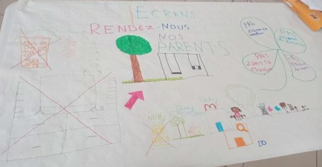 Ils se sont emparé des feutres pour réaliser une affiche dont le message est clair : « Maman, papa, reste moins sur tes écrans : conduis moi davantage au parc, viens jouer au ballon, amène-moi faire du vélo ou de la trottinette. Amusons- nous ensemble ! «